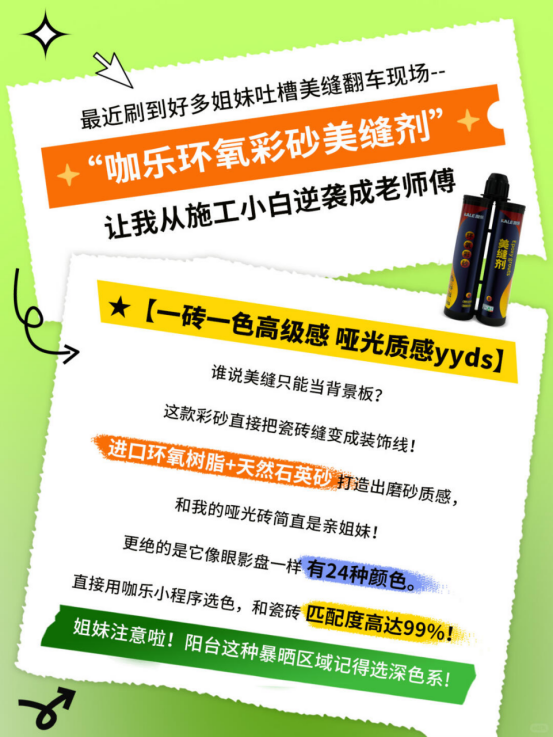作为刚给新房做完全屋美缝的装修课代表 今天必须安利这款让我从施工小白逆袭成老师傅的“咖乐环氧彩砂美缝剂”�� ��【一砖一色高级感 哑光质感yyds】 谁说美缝只能当背景板?这款彩砂直接把瓷砖缝变成装饰线!���� 进口环氧树脂+天然石英砂打造出磨砂质感,和我的哑光砖简直是亲姐妹! 更绝的是它像眼影盘一样有24种颜色 直接用咖乐小程序AI选色,和瓷砖匹配度高达99%!