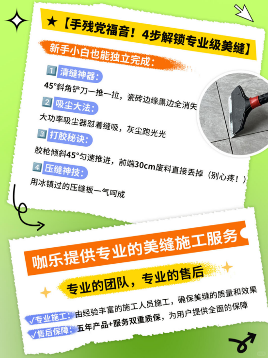 浅色系姐妹注意啦⚠️ 阳台这种暴晒区域记得选深色系 ��♀️【手残党福音!4步解锁专业级美缝】 新手小白也能独立完成: 1️⃣ 清缝神器:45°斜角铲刀一推一拉,瓷砖边缘黑边全消失 2️⃣ 吸尘大法:大功率吸尘器怼着缝吸,灰尘跑光光 3️⃣ 打胶秘诀:胶枪倾斜45°匀速推进,前端30cm废料直接丢掉(别心疼!) 4️⃣ 压缝神技:用冰镇过的压缝板一气呵成 除个人美缝,咖乐也提供专业的美缝施工服务 专业的团队,专业的售后 ✓专业施工:由经验丰富的施工人员施工,确保美缝的质量和效果
