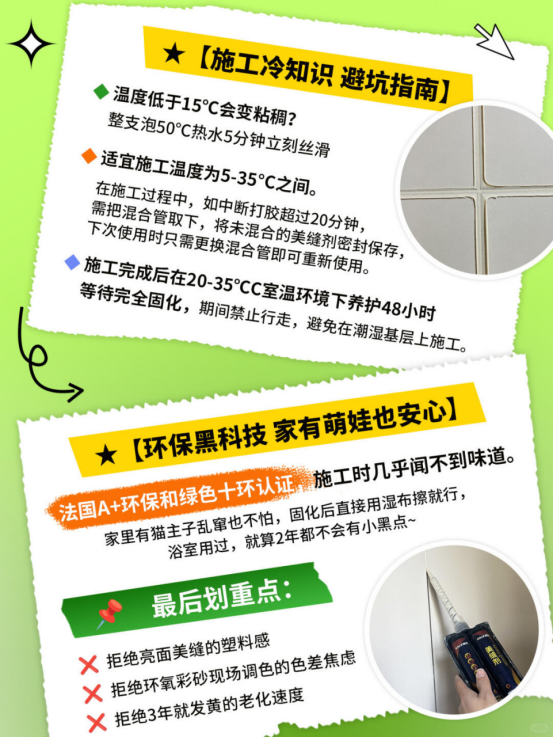 ✓售后保障:五年产品+服务双重质保,为用户提供全面的保障 ⏰【施工冷知识 避坑指南】 ✨ 温度低于15℃会变粘稠?整支泡50℃热水5分钟立刻丝滑 ✨适宜施工温度为5-35°C之间。 在施工过程中,如中断打胶超过20分钟,需把混合管取下,将未混合的美缝剂密封保存,下次使用时只需更换混合管即可重新使用。 ✨ 施工完成后在20-35C室温环境下养护48小时等待完全固化,期间禁止行走,避免在潮湿基层上施工。 ��【环保黑科技 家有萌娃也安心】 法国A+环保和绿色十环认证,施工时几乎闻不到味道。